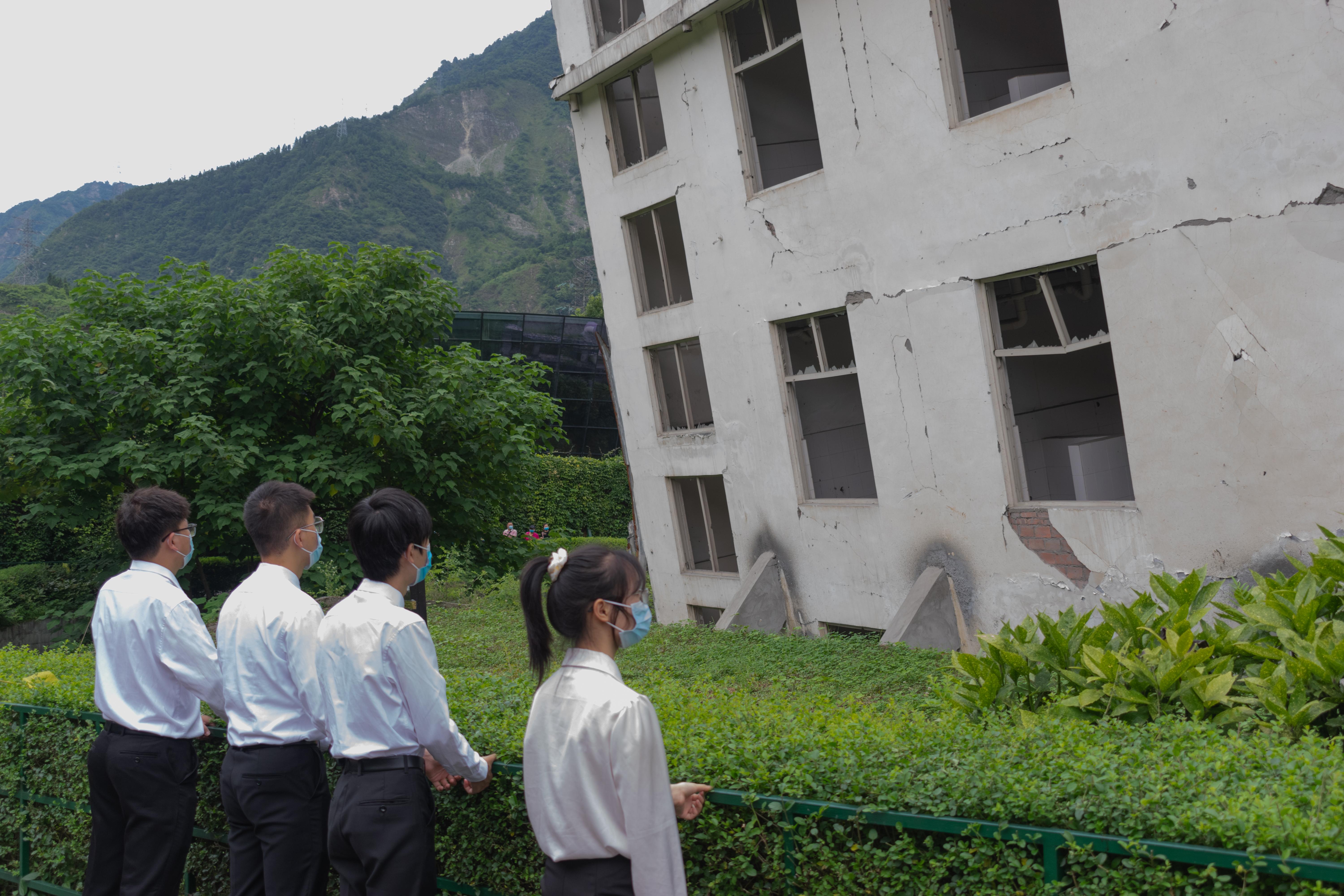 7月1日,实践队来到映秀镇漩口中学遗址,5·12大地震造成漩口中学43名员工、8名教师、2名职工、2名家属遇难,27名员工、2名教师严重受伤。走进遗址,每个人都因为一种说不出的沉重感而保持着庄严、肃穆。这里的建筑原本为5层,地震后,5层楼只剩下3层,3楼直接变1楼,原本的1楼2楼变为碎屑,可见5·12汶川大地震破坏性之大,地震发生在下午两点半左右,也就是员工们在上下午第一节课的时候,突如其来的地震在顷刻间夺走了成百上千人的生命,这其中很大一部分就是正在上课的员工。望着眼前已经倾覆的教学楼,当时还在一起欢声笑语的同学下一秒就消失在倒塌的楼板下,这惊悚片般的可怕场景在2008年5月12日真真切切地发生我们脚下的土地。当讲解员告诉我们,因为倒塌楼房结构等原因,有部分员工的遗体仍然被埋在废墟之下,每一个人的心情便更加沉重。