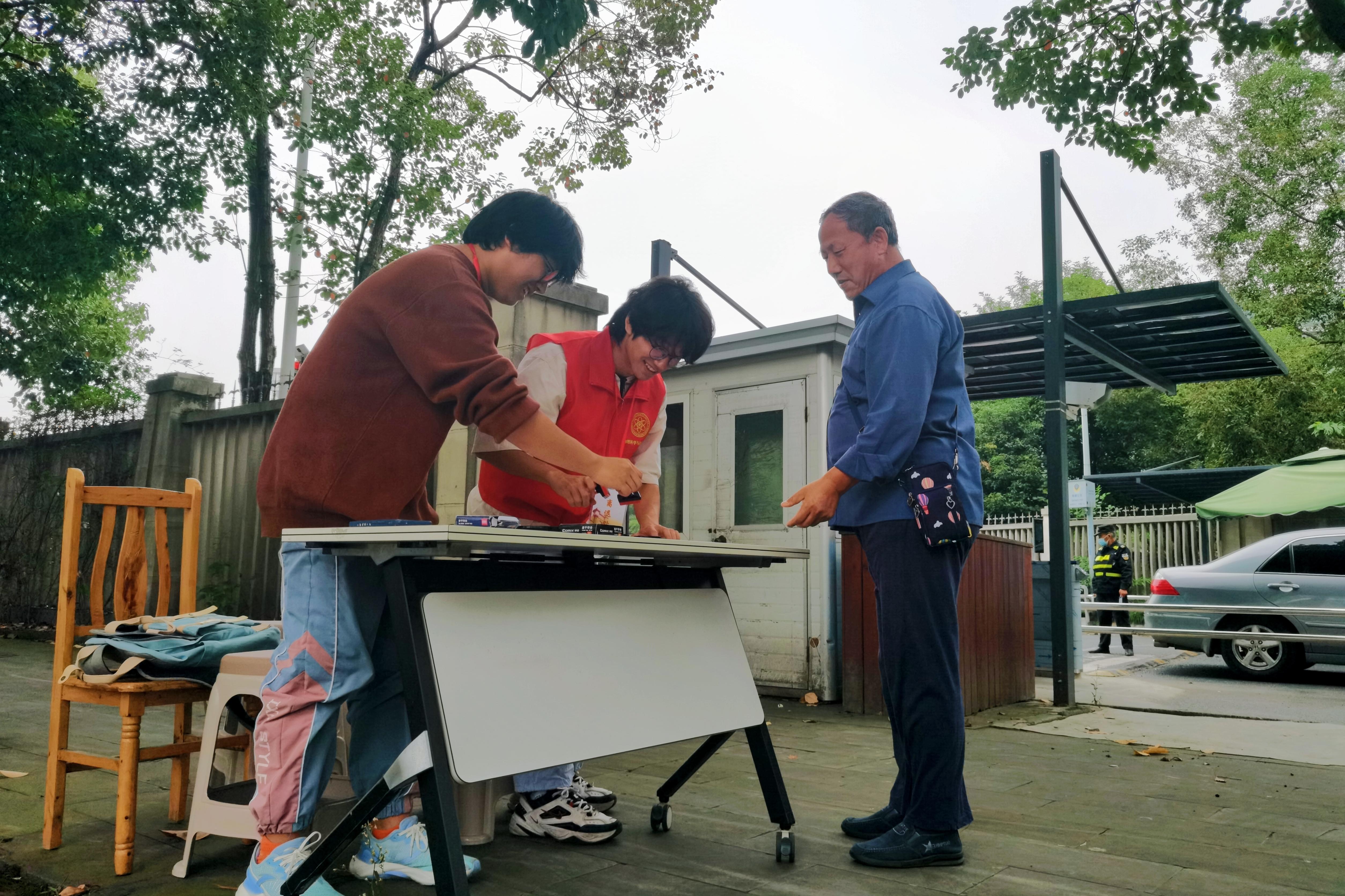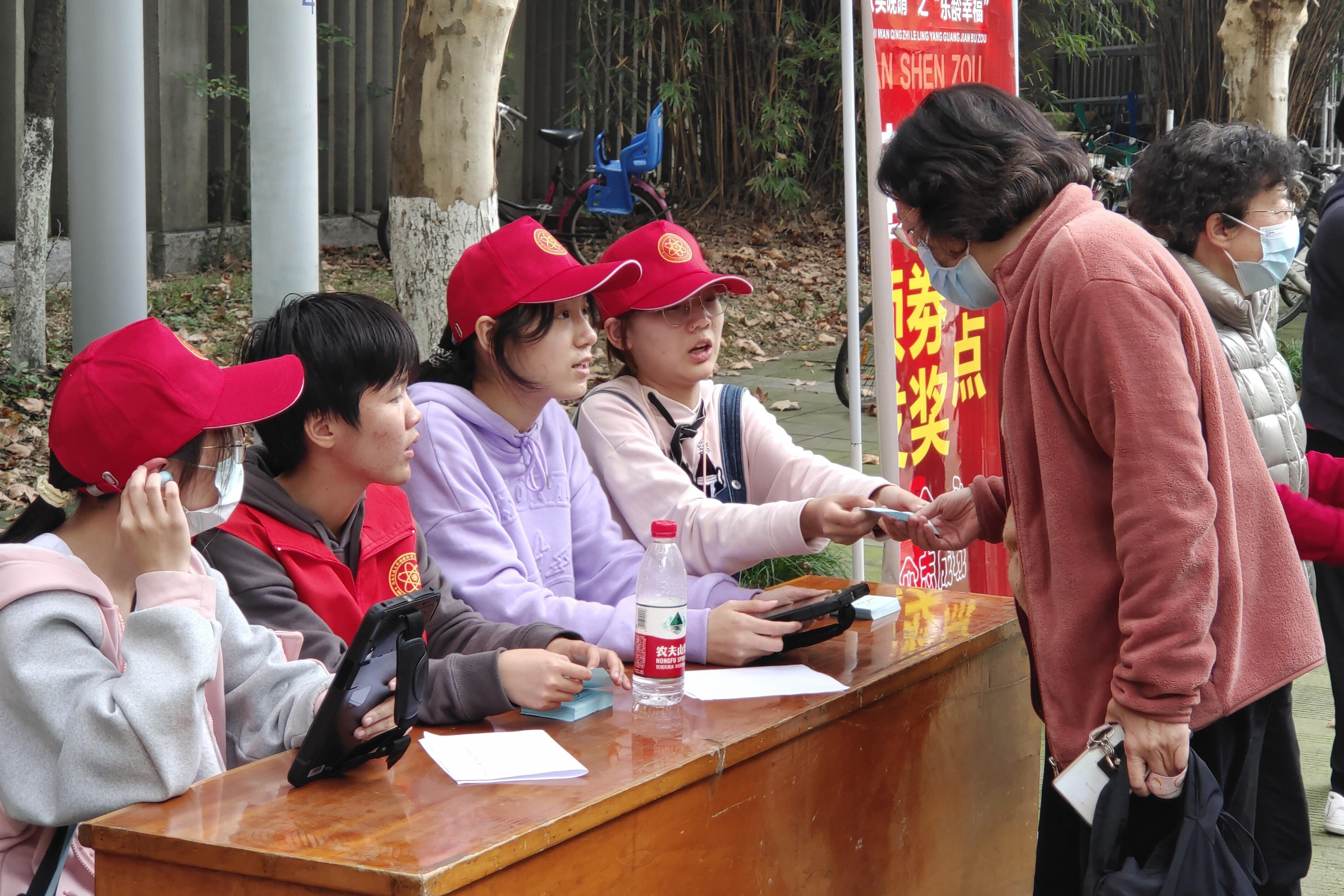 活动开始,离退休教职工们结伴而至,在志愿者的引导帮助下,沿规定路线完成健步走,并凭借活动盖章券在起终点处完成签退、领取活动奖品。活动进行时,志愿者们全程积极、热情协助,体现出太阳成集团tyc122cc志愿者尊师、奉献、友爱、互助的精神。此外,许多参与活动的离退休教职工与志愿者进行了合照并表达感谢。