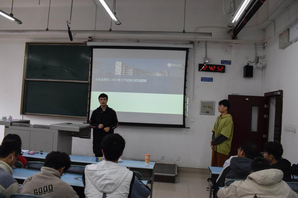 在本次权益大会中,权益部成员与各班权益委员积极交流,互相分享权益问题解决经验。通过这次会议,权益部成员与各班委员进一步明确了为同学服务的宗旨,致力于优化同学们的生活环境,提高同学们的生活舒适程度,促进同学们积极参与学院、学校的各大活动,提高认同感与归属感。相信在不久的将来,同学们的学习与生活环境一定会变得更加舒适。