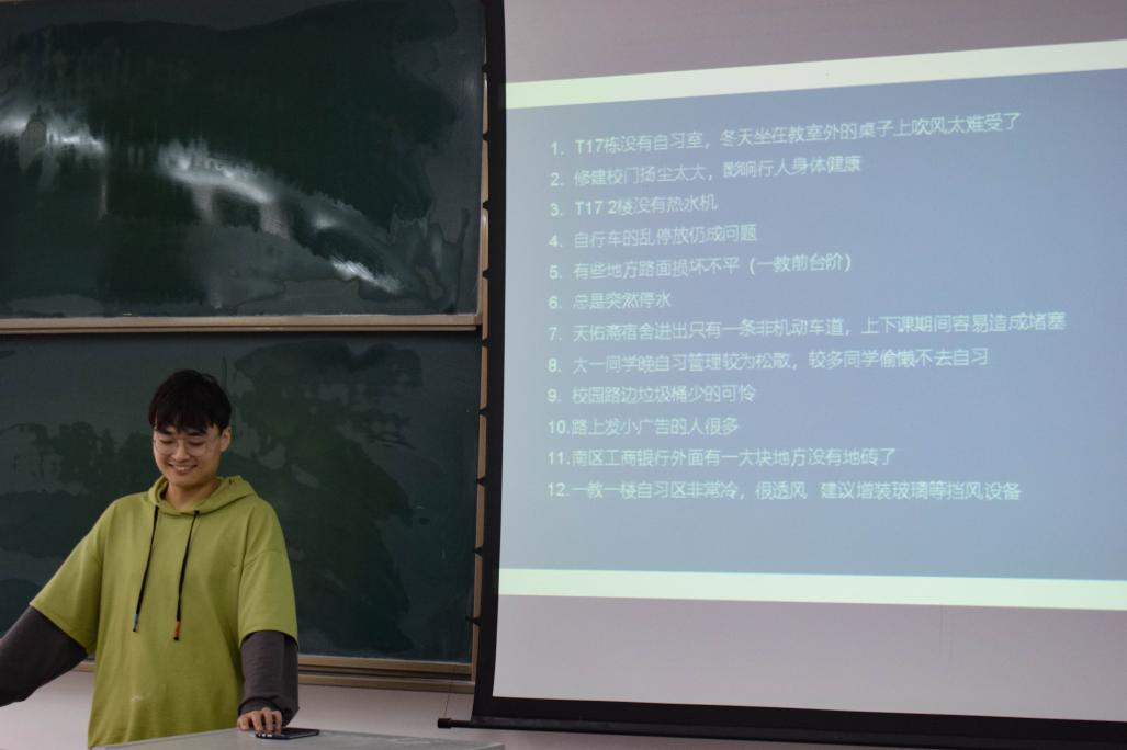 会议第二项,各班权益委员提案展示。权益部部长刘浩智收集并整理了各班权益委员的权益提案,并从各班权益提案中汇总出了12个主要问题,其中主要涉及交通、自习、寝室管理三个方面。权益部部长刘浩智分别从这三个方面出发,对12个主要问题进行了分析,并且与权益部成员和各班委员具体探讨了其对应的解决方案,争取早日解决存在的权益问题。