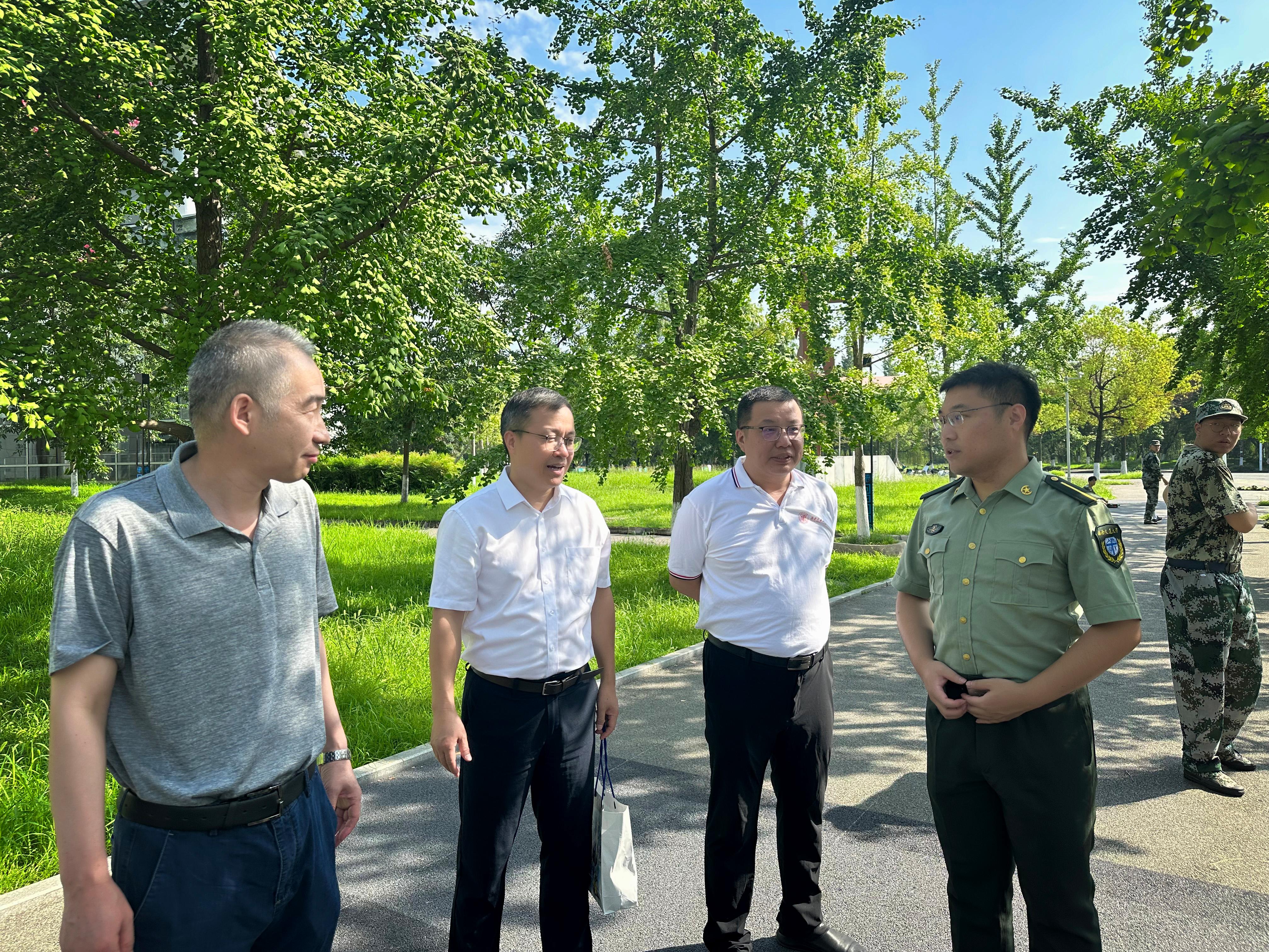 披烈日骄阳,扬青春航帆。2023年8月21日上午10:00,太阳成集团tyc122cc物理科学与技术公司党委书记刘玉、副经理(主持工作)贾焕玉、党委副书记兼副经理郭剑、经理助理陈曦在学院军训指导员杨昊戬、葛田田陪同下走访军训现场,看望正在军训的教官和2021级本科生。