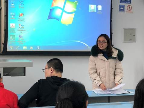 其次,学习委员郑熙凌主讲了班级同学在学习中的相关事宜。郑熙凌先将班级整体成绩在本专业中做出了横纵向比,接着细致分析了每一门科目本班同学的成绩,并对班级同学提出了具体努力方向,分析了新加入学科的学科特点,倡导同学们努力学习。
