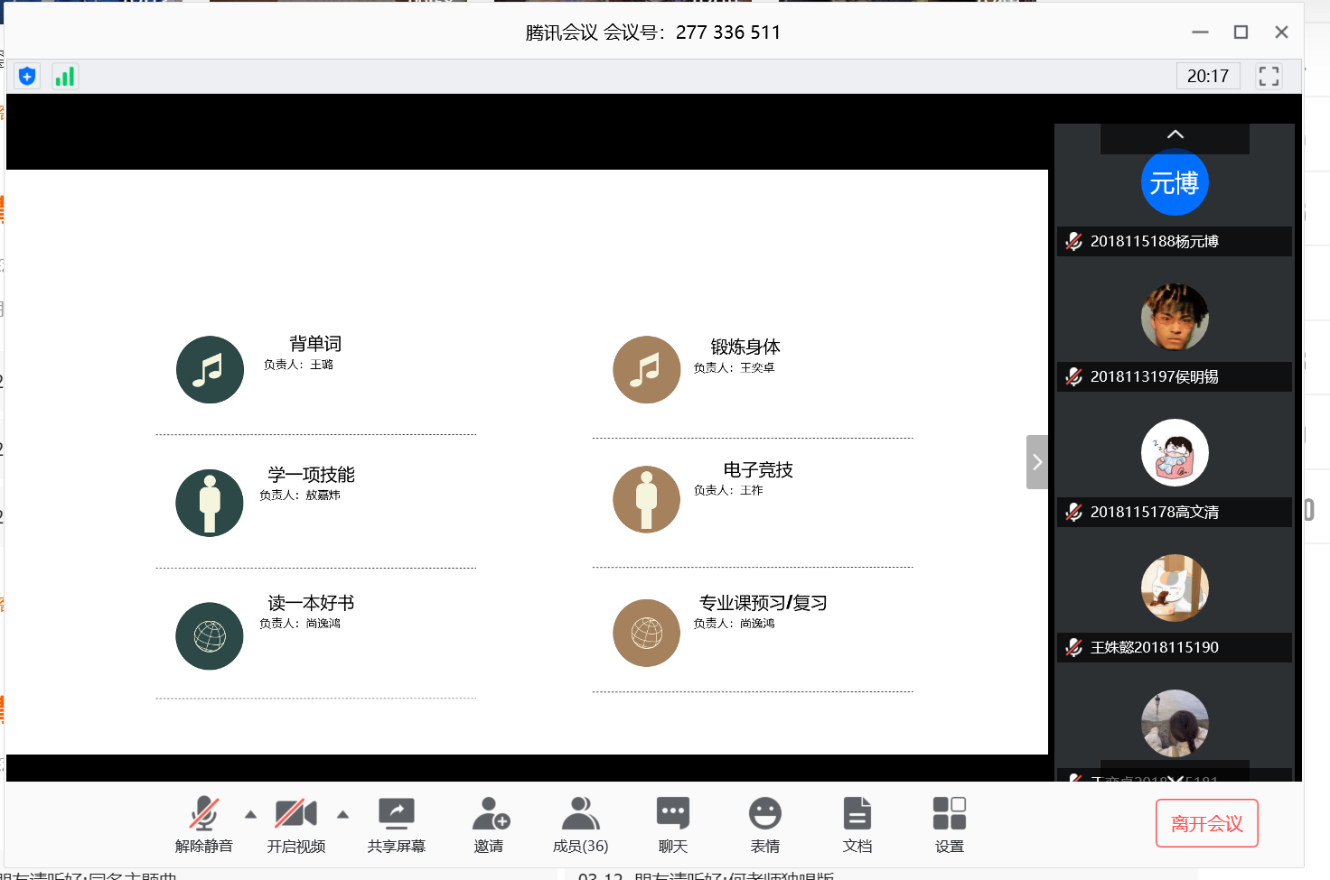 会议开始,学习委员王祚同学对班级大一、大二上学期的成绩进行了对比总结,并对往届的保研情况进行分析。之后,两位学习进步显著的同学分享了他们的学习经验。随后,全班同学逐一对居家上网课的状态发表自己的看法,班长对同学们的问题作了总结并且给出意见。