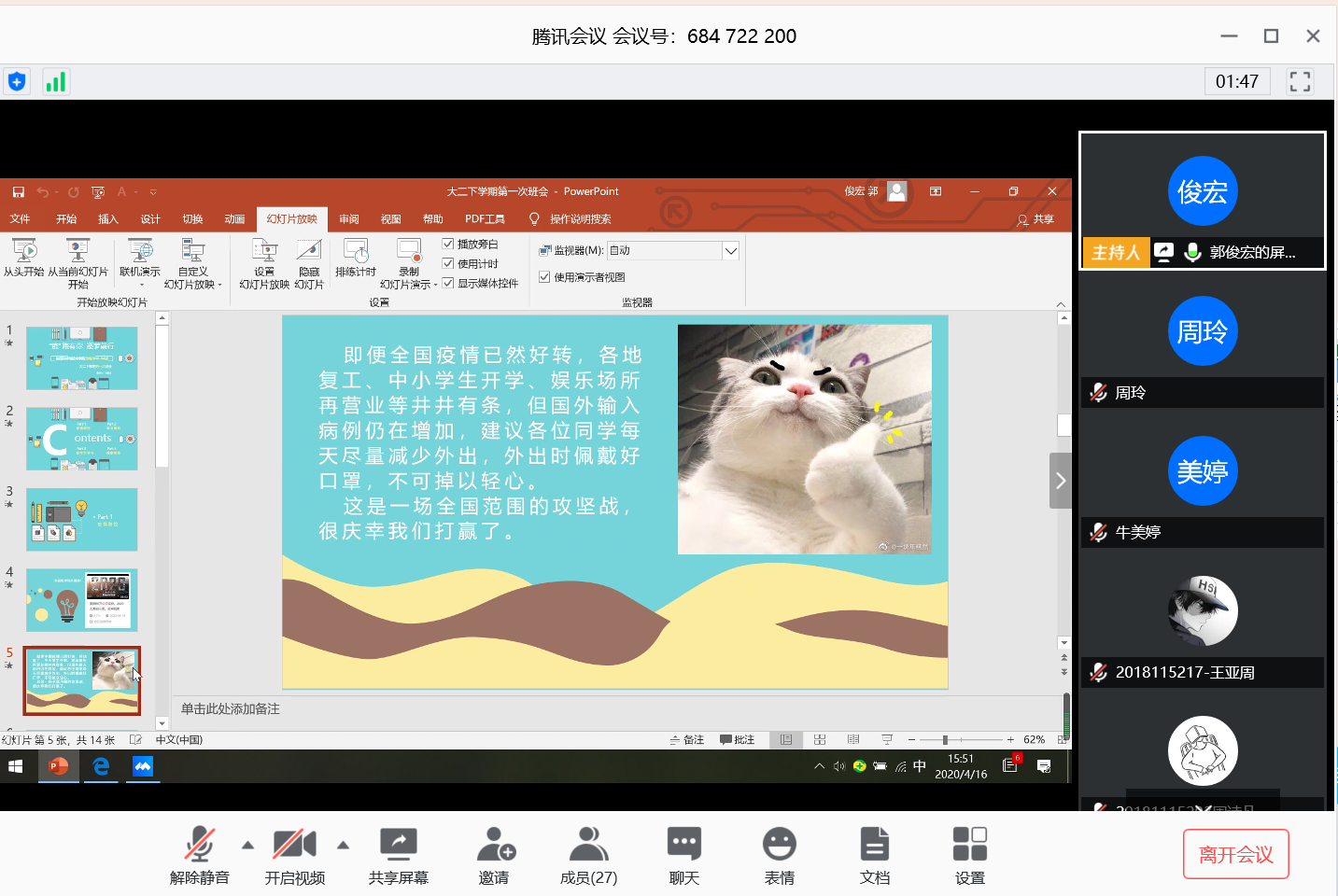 此次云主题班会,将光电4班同学在线上凝聚,增强了同学们的抗疫知识,提高了学习动力。相信通过此次班会,同学们在疫情期间也能做到完善自身,逐梦前行。