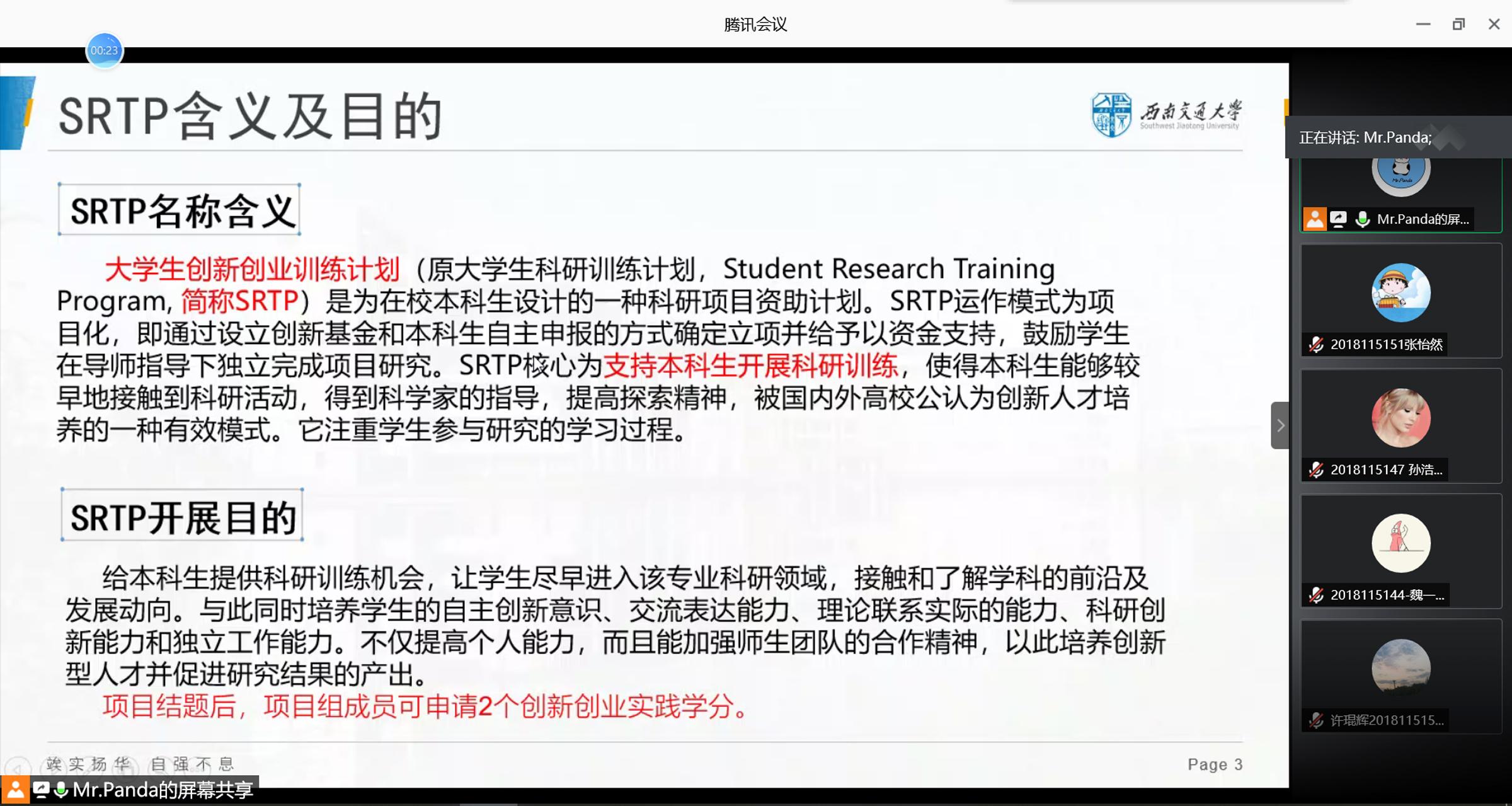 接下来,潘国勋同学详细介绍了老员工创新创业训练计划(即Student Researching Training Program,简称SRTP)。SRTP是为在校本科生设置的一种科研项目资助计划,旨在给本科生及早进入科研领域的机会,接触了解学科前沿发展,并提高个人科研能力,培养创新意识,加强团队合作精神。