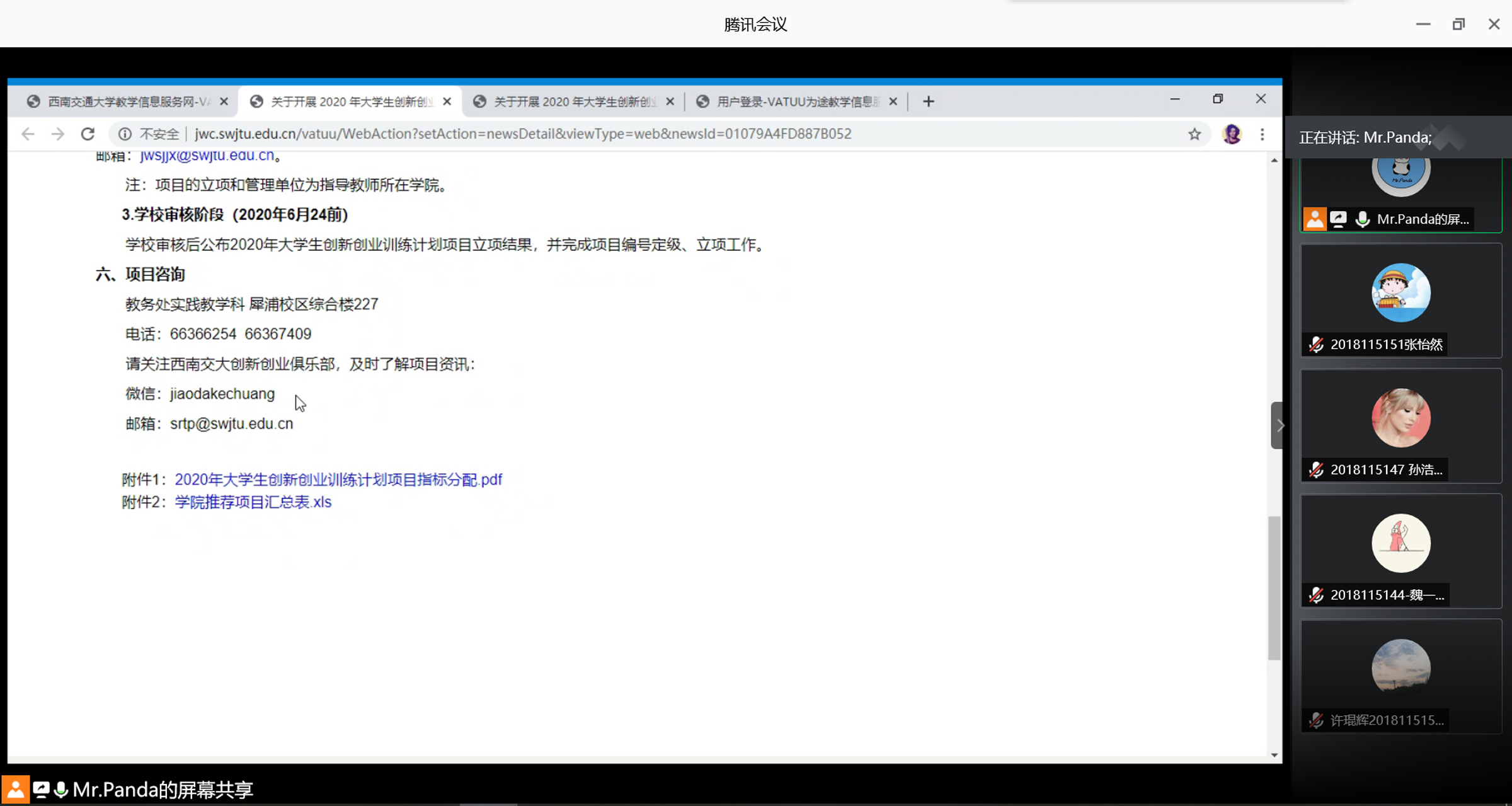 为了解答同学们对SRTP立项方面的疑惑,潘同学为大家解读了教务网《关于开展2020年老员工创新创业训练计划立项工作的通知》,详细讲解了立项的截止日期、人数、选题等注意事项,解答了大家的疑问。