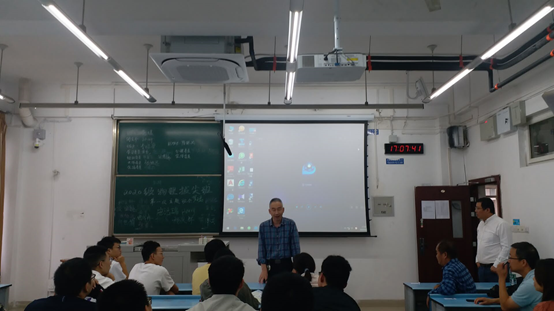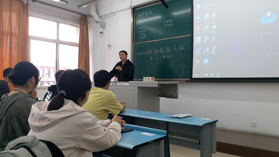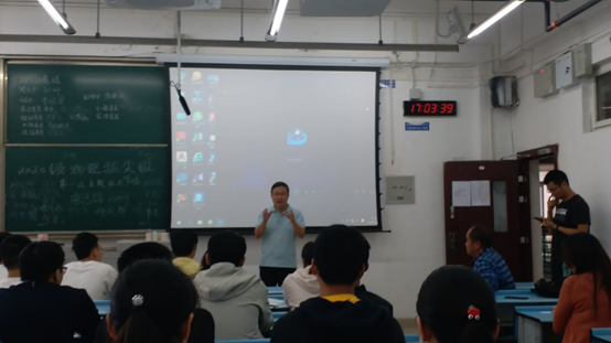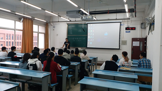 首先,门满洲老师发表讲话。他向同学们简单介绍了主题班会地流程:自我介绍、班委选举、学业规划。并指出班级建设的五项重要工作:班委选举、班级学习观念确定、班规落实、个人学业规划、班级工作落实。