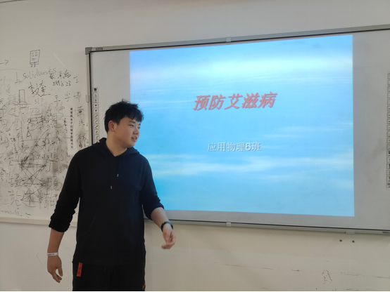 然后,由班长进行对艾滋病预防知识的讲解。帮助同学们正确的认识艾滋病,了解艾滋病的传播途径和预防措施。同时,也讲解了艾滋病对身心健康的危害,提醒同学们的洁身自爱。