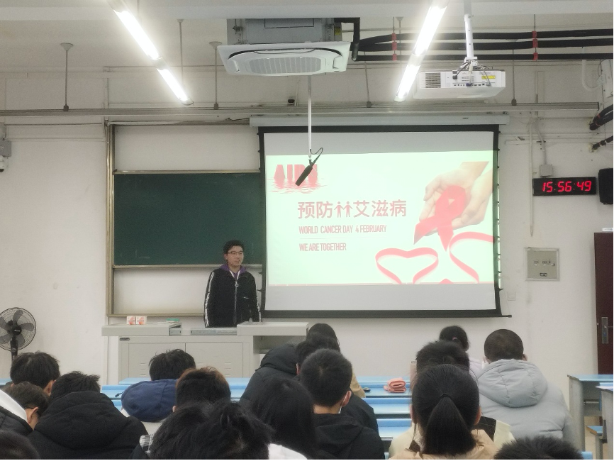 首先是心理委员董璐恒带来的预防艾滋病主题宣讲。他首先介绍了艾滋病的相关常识,包括艾滋病的定义、历史、自然发展过程与传播途径。随后,他着重强调了艾滋病对于多方面的危害,包括个人、家庭、国家及社会方面。与此同时他提到,艾滋病在日常接触中不会传染,我们要关爱艾滋病人。并做好预防艾滋病措施。