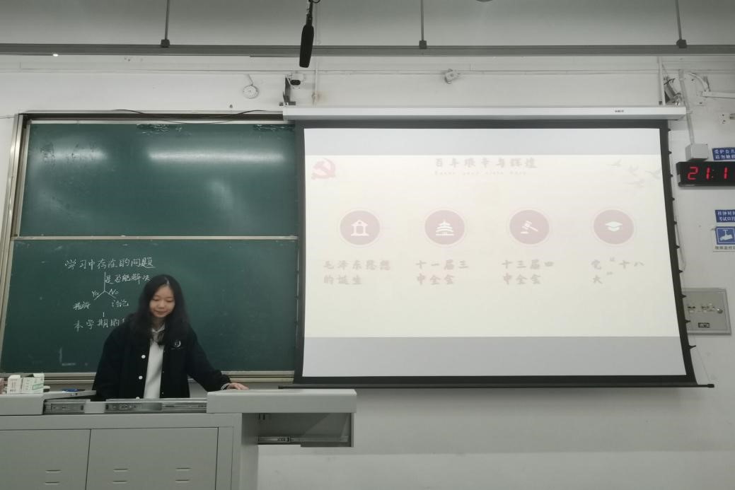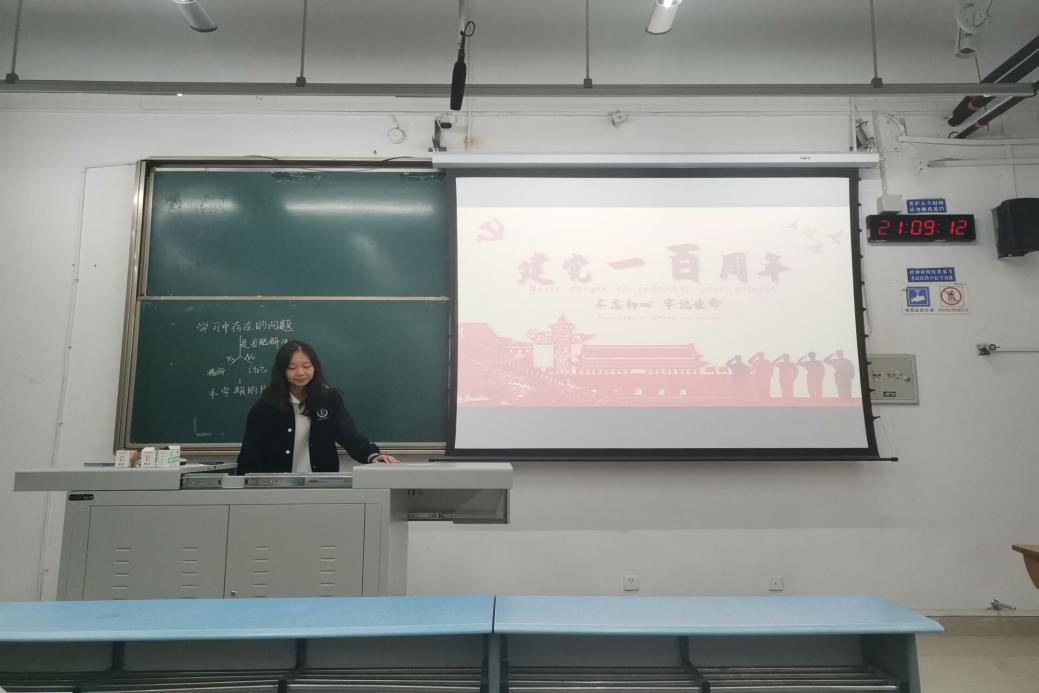 首先,团支书叶香池同学从中国共产党的成立、党史的发展脉络、百年艰辛与辉煌、开创新的篇章这四个方面为我们讲解了中国党从成立至今的一百年里艰苦奋斗的历程,以及在新的时代我们党和我们国家的奋斗目标。在叶香池同学的讲解下,同学们对党史以及我们国家的发展历程有了更为充分的认识,对中国共产党也怀着更为崇高的敬畏之心。