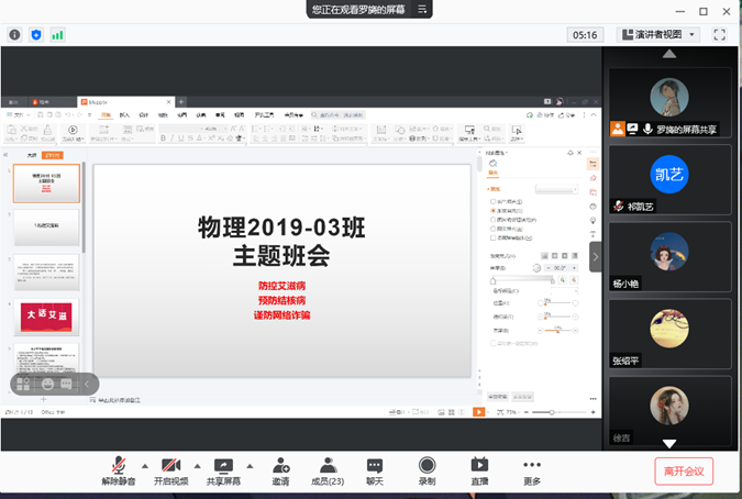 2021325日下午四时,2019级应物3班在网络会议上召开了大二学年第三次主题班会。本次班会由宣传委员罗旖主持,除一人请假外,三班其余23人均参加了此次班会。