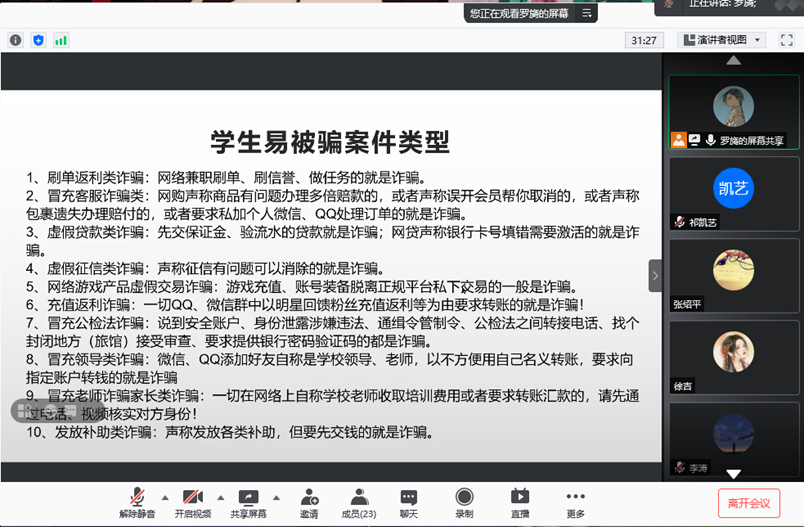 最后,罗旖同学向大家介绍了网络诈骗,给大家看了很多员工容易被骗的案例,以及让全体同学关注“熊猫反诈”的微信公众号,防范网络诈骗。