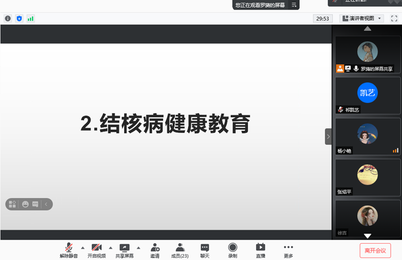 其次,罗旖同学对大家进行了结核病的健康教育。她向全体同学介绍了结核病及其危害,以及告诉大家如何防范结核病,注意自身卫生健康。