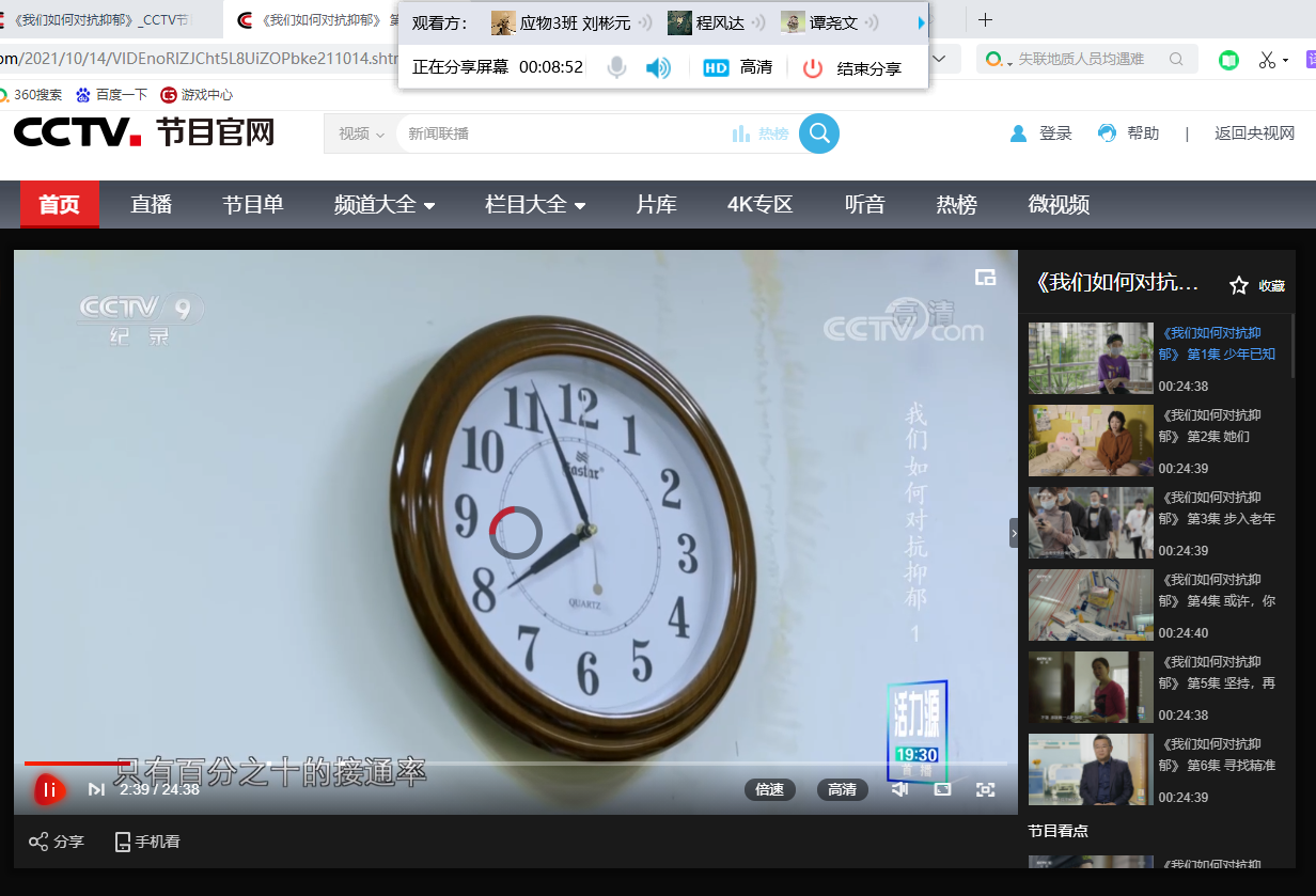 2021年11月22日晚7点,太阳成集团tyc122cc2019级应用物理系三班的同学,在心理委员张婷蕙的带领下,通过腾讯会议集体观看了央视网节目《我们如何对抗抑郁》。通过观看该节目,同学们从个人、家庭、社会多个角度深入了解了抑郁症的影响,学习了一些对抗抑郁的经验与方法。