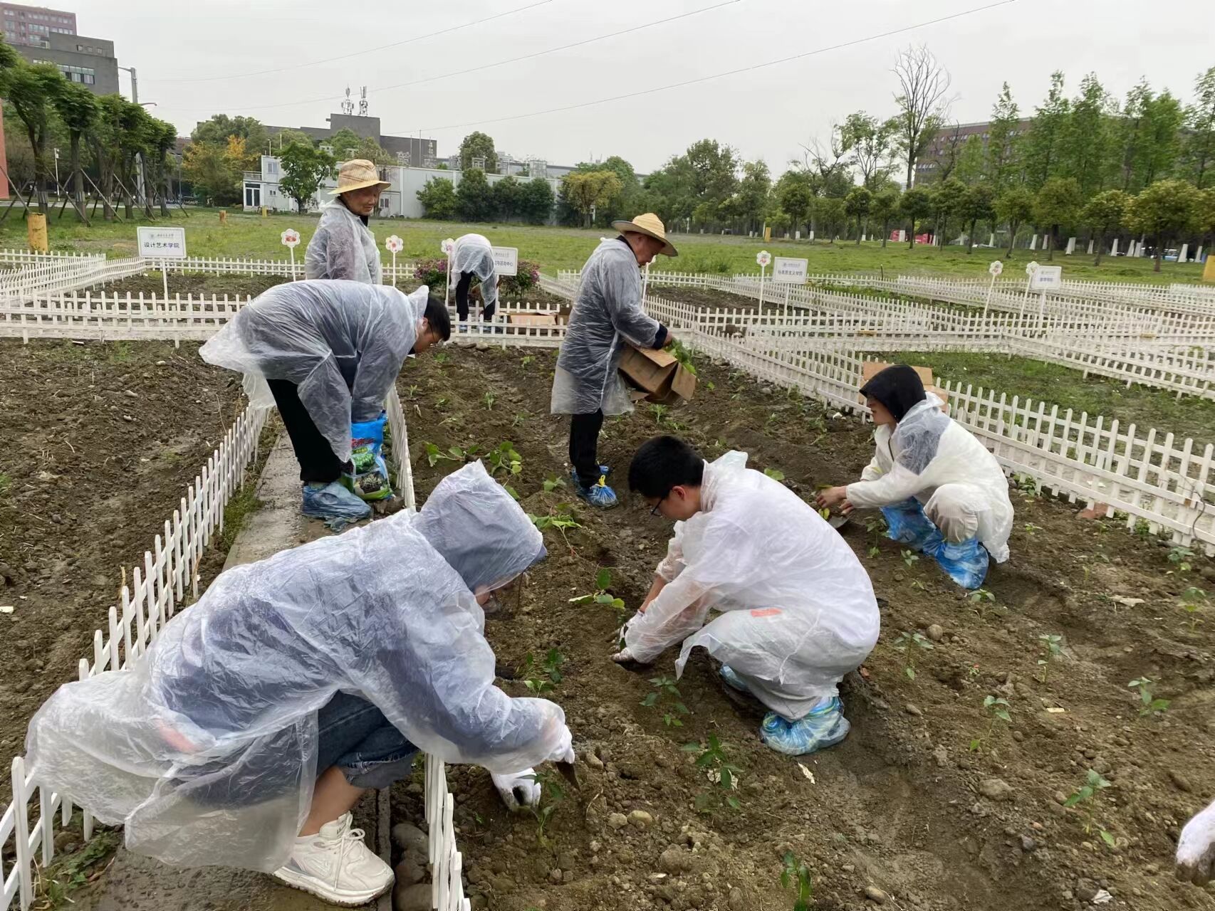 Although it started to rain lightly, the teachers and students were not afraid of the cold rain. They put on simple raincoats and continued to work in the fields. They squatted, knelt, and stood for a long time, occasionally straightening up to refresh their spirits and continue to engage in labor. Drops of water flowed down from the faces of teachers and students, and it was unclear whether it was rain or sweat, but they all became the source of irrigation and created happiness with their own hands.