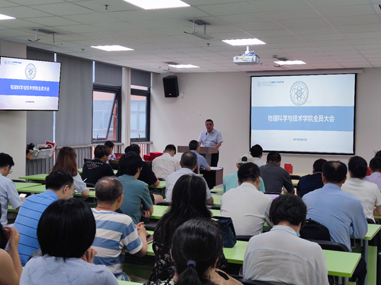 On the morning of June 21st, 2023, the School of Physical Science and Technology held a general meeting for all faculty and staff in conference room 30334 of Xipu Campus. The meeting was attended by the school's party committee secretary Liu Yu, Vice President (in charge of work) Jia Huanyu, other members of the leadership team, and all faculty and staff. The meeting was presided over by Guo Jian, the deputy secretary of the school's party committee and vice president.