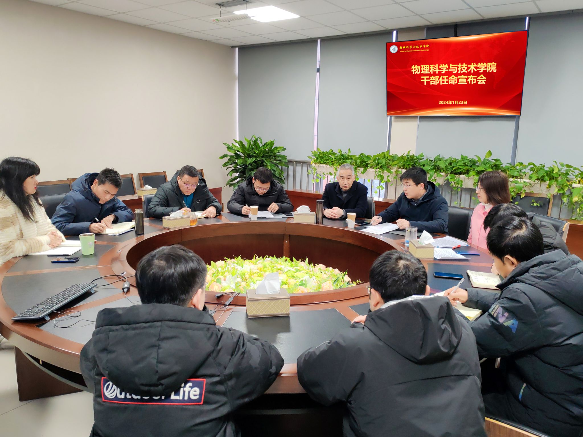 On the afternoon of January 23, 2024, Song Xin, Executive Deputy Minister of the University Party Committee Organization Department, and Yan Pulong, Vice President of the Party School, visited the School of Physical Science and Technology to announce the cadre appointment notice. Members of the school's party and government leadership team, party committee members, and heads of departments attended the meeting. The meeting was chaired by Yan Pulong.