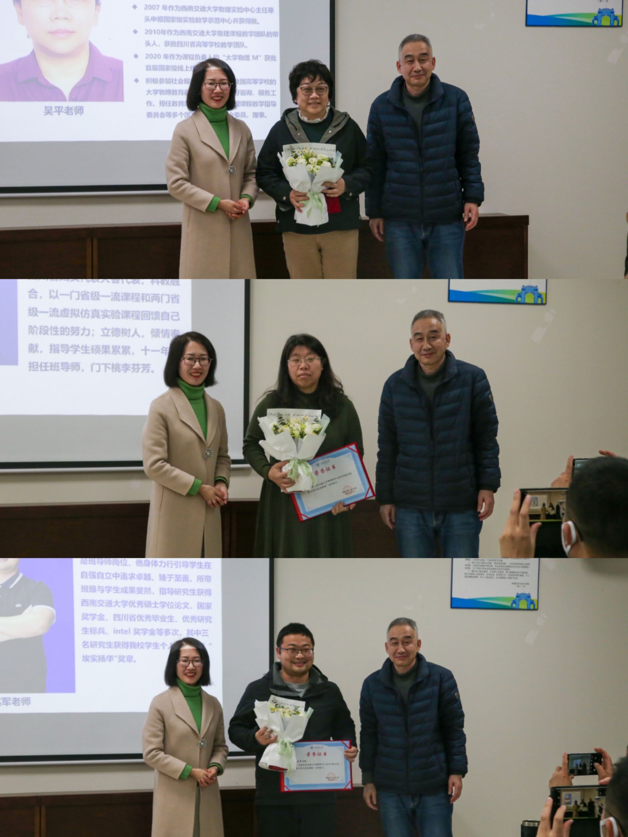 Li Zhuohui, Secretary of the Party Committee, and Jia Huanyu, Executive Dean, presented certificates and flowers to the outstanding teachers of the school's first "Educational Excellence" Awards, including Liu Qijun, Wu Ping, Zhu Fengrong, and Gao Xiaorong.