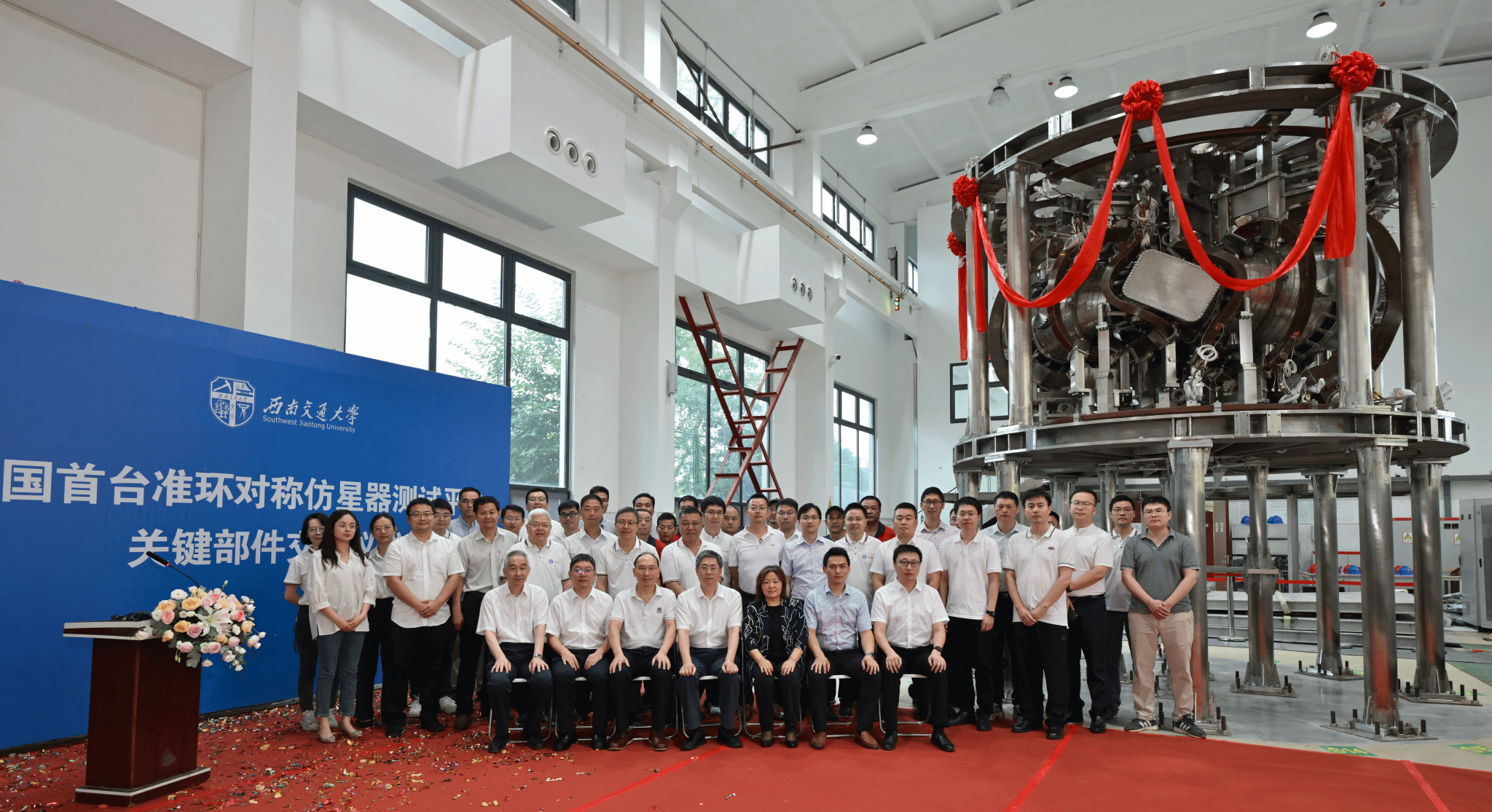 On the morning of July 13, 2024, at 10:00 AM, the handover ceremony for the key components of China’s first Quasi-axisymmetric Stellarator Test device (CFQS-T) was held at the Technology Industrial Park, Building F, JiuLi Campus of Southwest Jiaotong University. Attendees included Vice President Kang Guozheng of Southwest Jiaotong University, Chief Scientist Xu Yuhong of the quasi-axisymmetric stellarator, General Manager Wu Xinlian of Hefei Keye Electric Physics Equipment Manufacturing Co., Ltd., Deputy Director Ji Xiaoqian of the Fusion Science Institute at the Southwest Institute of Physics, Acting Dean Jia Huanyu of the School of Physical Science and Technology, and Deputy Commander Zhang Sheng of the stellarator construction command. The ceremony was hosted by Cheng Jun, Head of the Technical Department of the stellarator construction command.
