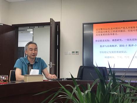 Jia Huanyu shared his experience in studying Yan 'an rectification: the Marxist ideological line of starting from reality, integrating theory with practice and seeking truth from facts. Jia Huanyu combined with the work of the school, sorted out the responsibilities and filled the shortcomings: First of all, the lack of natural funds is the shortcoming of the scientific research work of the college. For young teachers, the first breakthrough is to apply for youth fund projects. At present, the successful application rate of school youth fund is not high; Secondly, in the process of organizing and managing youth funds, we should grasp the key minority; Thirdly, in terms of teachers' ethics, we should further promote the construction of a rigorous study style.