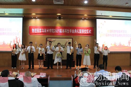 In order to welcome the centenary of the founding of the Party, before the ceremony, all teachers and students watched the MV song "Youth", which was the theme of the centenary of the founding of the Party, paying tribute to the Party, feeling the kindness of the Party and following the Party. Teacher Chen Xi announced the commencement of the 2021 Undergraduate Graduation Ceremony of the College of Physical Science and Technology. All the teachers and students stood up and sang the national anthem.