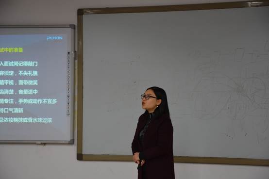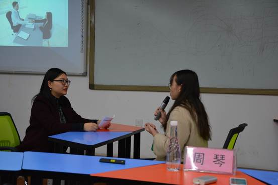 活动伊始,周琴老师对到场的同学们做了一个小调查:有多少同学经历过包括员工组织面试在内的各类面试。结果经历过面试的同学并不多,周老师便以“什么是面试”为切入点,从面试前的简历制作讲起,介绍了面试常见的三种类型、面试中基本会被问及的问题以及回答这些问题的技巧。在讲到“如何进行自我介绍时”,周老师结合一正一反的实例,提醒同学们:自我介绍时间不宜过长,1分钟左右为最好,同时应简要说明自己的求职动机以及自己与职位相匹配的能力,为面试官留有提问的余地。