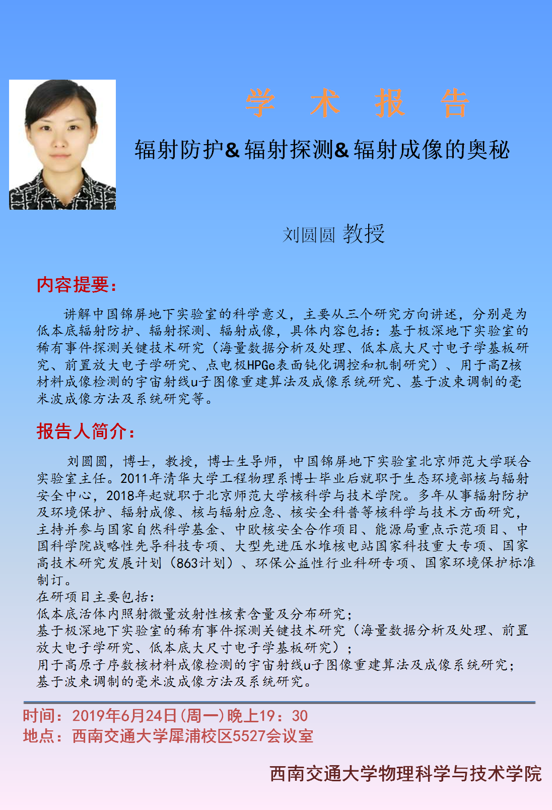 报告人简介:刘圆圆,博士,教授,博士生导师,中国锦屏地下实验室北京师范大学联合实验室主任。2011年清华大学工程物理系博士毕业后就职于生态环境部核与辐射安全中心,2018年起就职于北京师范大学核科学与技术学院。多年从事辐射防护及环境保护、辐射成像、核与辐射应急、核安全科普等核科学与技术方面研究,主持并参与国家自然科学基金、中欧核安全合作项目、能源局重点示范项目、中国科学院战略性先导科技专项、大型先进压水堆核电站国家科技重大专项、国家高技术研究发展计划(863计划)、环保公益性行业科研专项、国家环境保护标准制订。