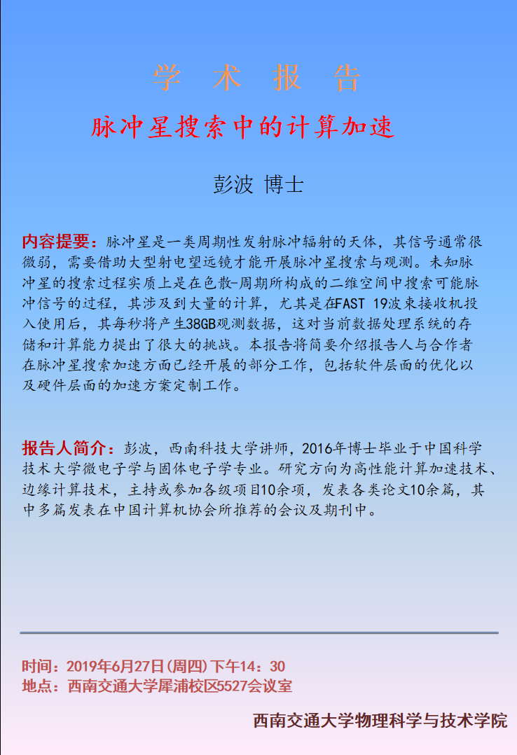 【学术通知】彭波博士关于脉冲星搜索中的计算加速的学术报告