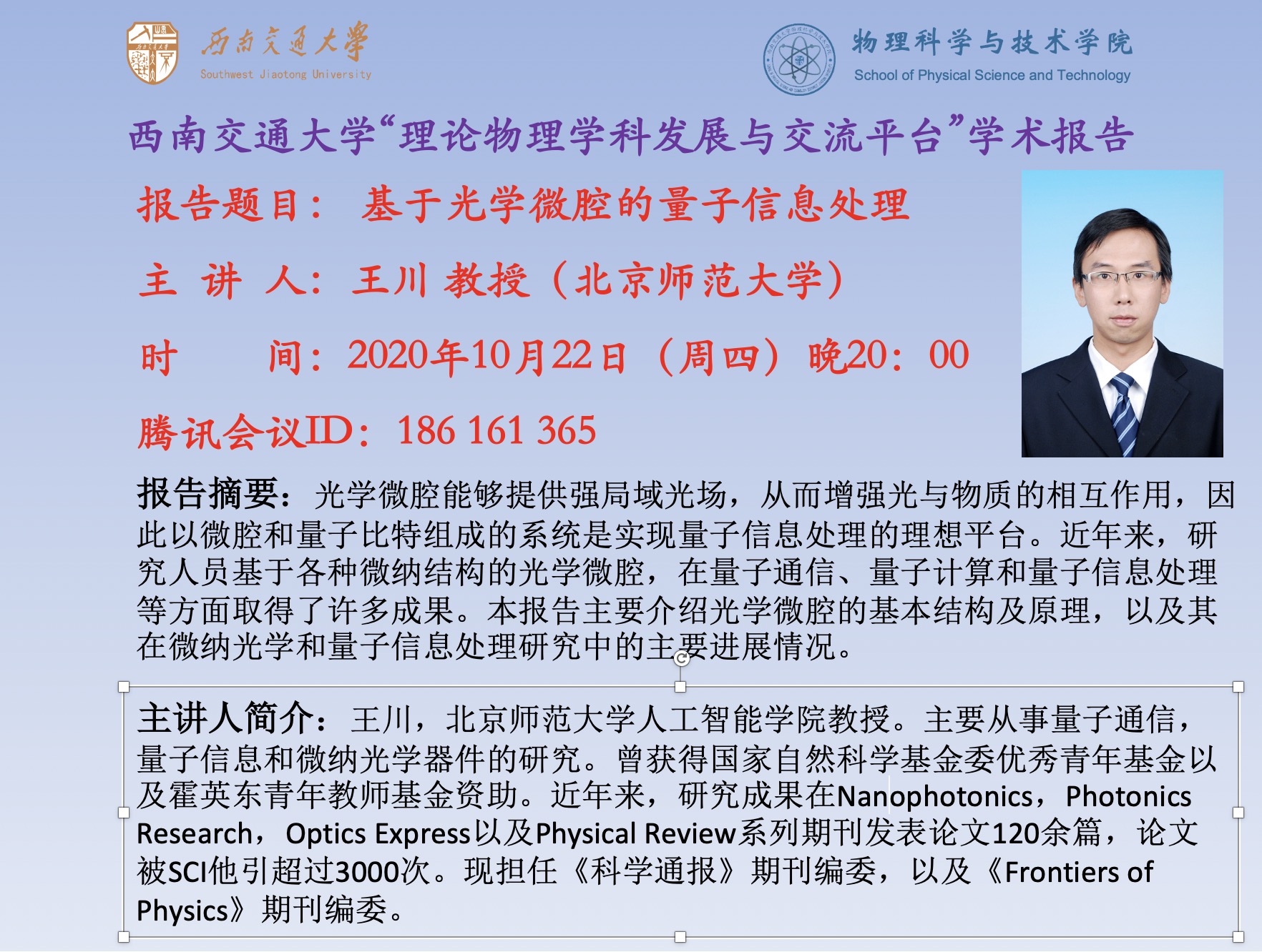 报告题目:基于光学微腔的量子信息处理