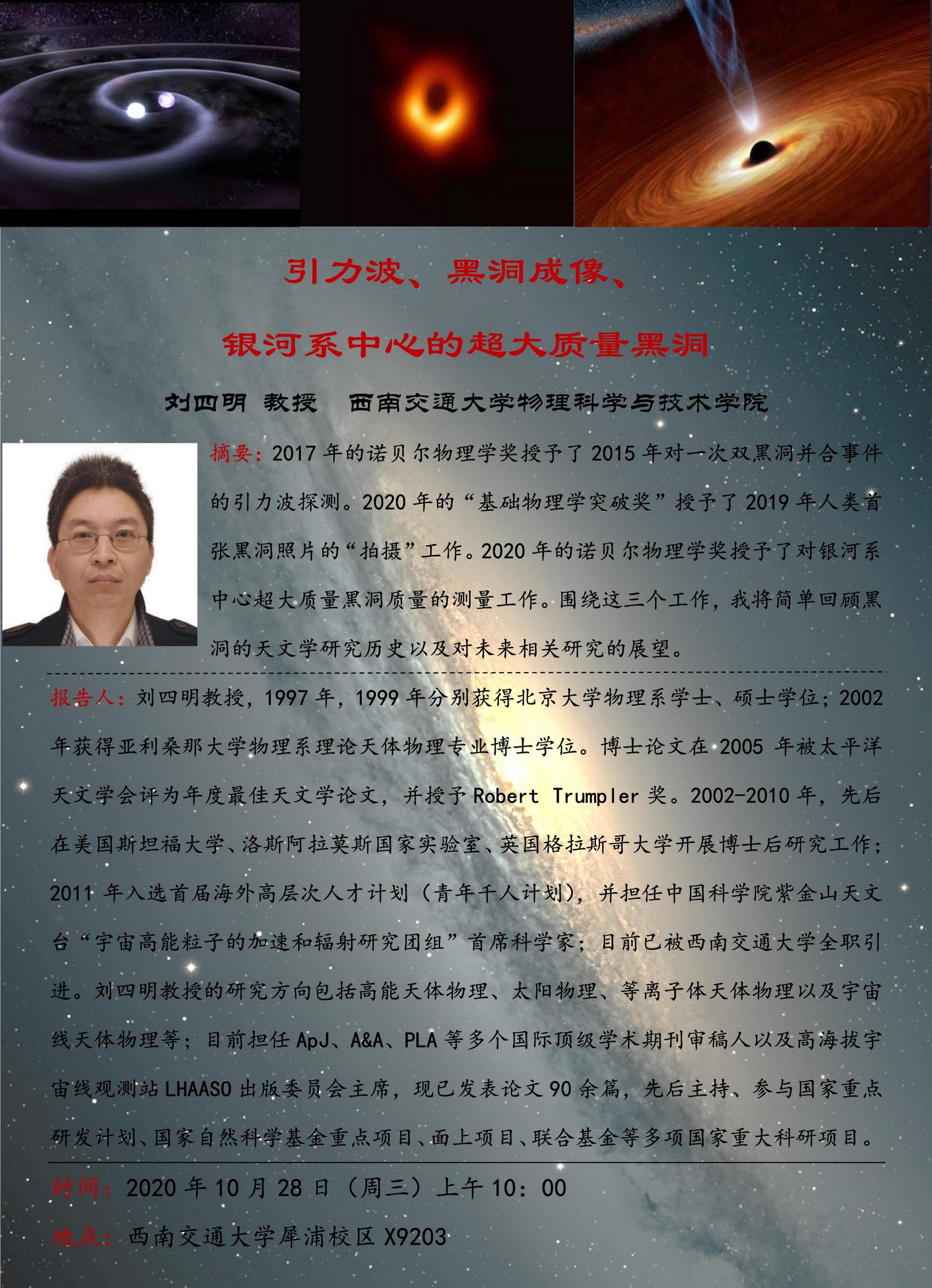 摘要:2017年的诺贝尔物理学奖授予了2015年对一次双黑洞并合事件的引力波探测。2020年的“基础物理学突破奖”授予了2019年人类首张黑洞照片的“拍摄”工作。2020年的诺贝尔物理学奖授予了对银河系中心超大质量黑洞质量的测量工作。围绕这三个工作,我将简单回顾黑洞的天文学研究历史以及对未来相关研究的展望。