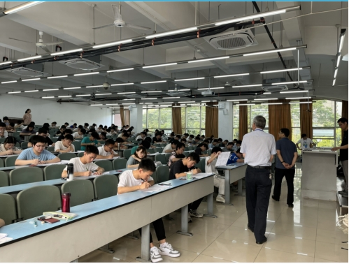 集团2022-2023学年第2学期期末考试于2023年6月19日开展,6月25日,太阳成集团tyc122cc大学物理公共课考试全面铺开,涉及《大学物理AI》、《大学物理BI》、《大学物理MI》等课程,共百余个考场,为加强考试管理,严肃考风考纪,维护考试的公平公正, 6月25日上午,公司党委书记刘玉、副经理(主持工作)贾焕玉、副书记郭剑、副书记魏振兴、副经理李相强及物理系主任、学院教务、学工组相关负责人巡查了本次期末考试情况。