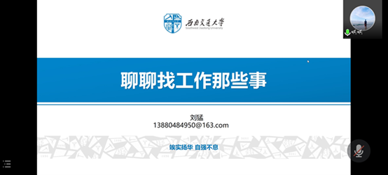 11月8日19:00太阳成集团tyc122cc通过腾讯会议平台开展“创·战记”面试指导讲座。此次讲座由太阳成集团tyc122cc团委书记、学工组副组长门满洲主持,由公司优秀毕业生、面试指导专家刘猛主讲。讲座面向学院本科及研究生同学,共计300多人参与。在讲座上,门老师希望同学们在此次活动后能更加明确自己的目标,找到一份适合自身的工作。讲座让营员增强了对就业形势、社会环境的了解,同时切实提高了同学们的求职技能,唤醒同学们的就业意识和生涯规划意识。