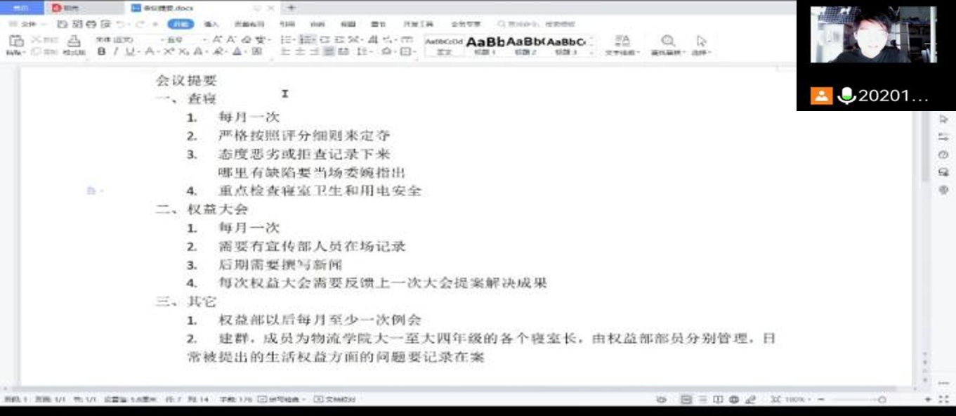 本次会议的第一项内容是向全体新任大一权益委员介绍每月一次的查寝工作,重点强调了其职能和主要作用,并向大家明确了本学期具体的寝室走访的方式,建立起“权益大会后走访寝室询问反馈”提案收集与反馈制度。