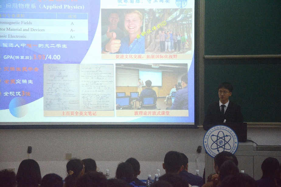 答辩会第一部分,由朱宏旺和洪瑞阳两位候选人进行了“竢实扬华奖章”的答辩展示。他们分享了自己自入学以来的成长经历和点滴收获,包括学业发展、科研竞赛、社会实践等,他们的成绩让在场的同学们深感钦佩。作为优秀学子,他们为学弟学妹们树立了具有启发性的榜样,激发了在场每一位同学的斗志和热情。