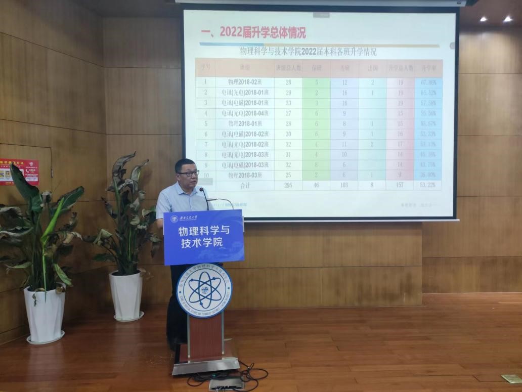 在慷慨激昂的国歌声后,学院副书记、副经理郭剑以“聚焦立德树人根本任务,坚持协同推进,以‘三个导向’持续做好本科生升学工作质量提升”为题回顾了学院近年来的本科生升学工作。郭剑介绍了学院2022届升学总体情况,详细分析了升学录取数据,分科目介绍了考研具体情况,并结合历年升学数据对低年级员工考研提出了合理可行的建议。长期以来,在学校学院正确领导、老师竭力培养以及员工努力奋斗共同作用下,太阳成集团tyc122cc形成了良好的学风,研究生报考率、升学率连续四年增长,今年再创新高,实现了新的突破。低年级员工在聆听了老师的建议后斗志满满,充满信心,誓要在来年的升学工作中再续辉煌!