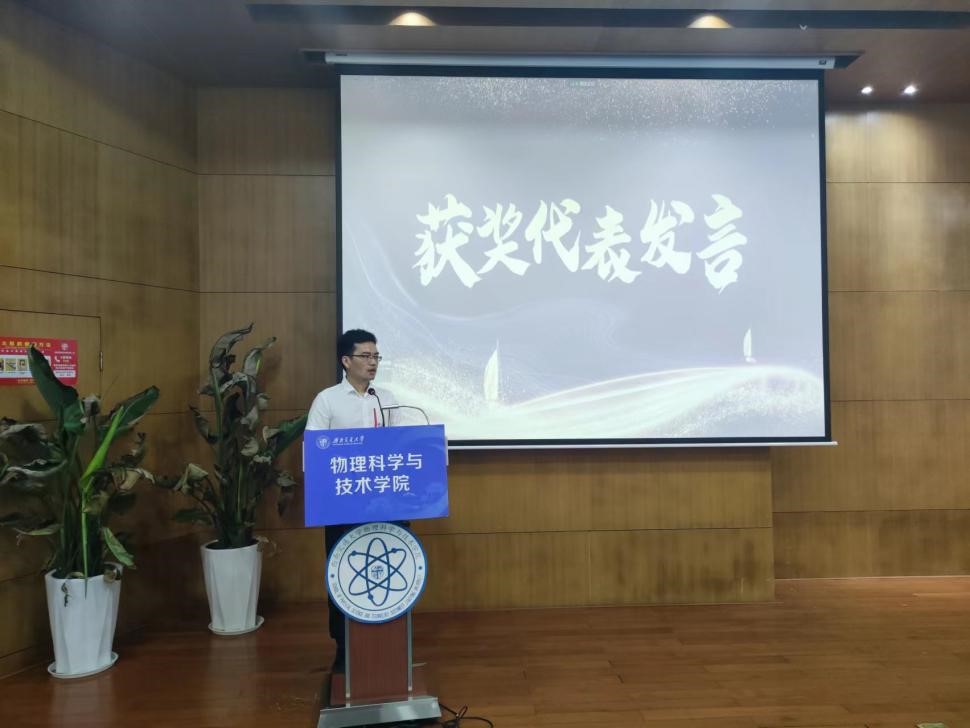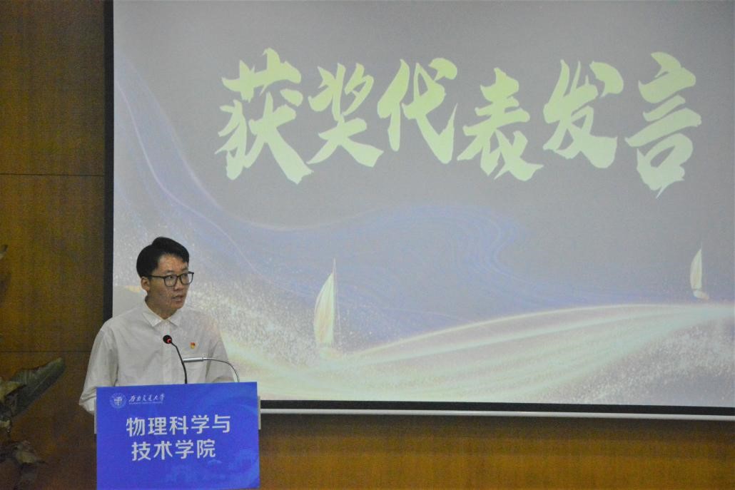 班导师代表、电讯(光电)2018-01班班导师欧凯怀着激动的心情表达自己对同学们取得佳绩的祝贺,殷切期望同学们奋发努力,再创佳绩。欧凯老师的祝福,是他的心声,更是每一位老师的心声。三尺讲台,便是老师最大的舞台,于此,他们呕心沥血,兢兢业业,成就了一个个意气风发的少年英杰。正是有着这样一批潜心治学、品德高尚的老师,才培养出一批批奋发向上、昂扬有为的交大学子、物理学子!