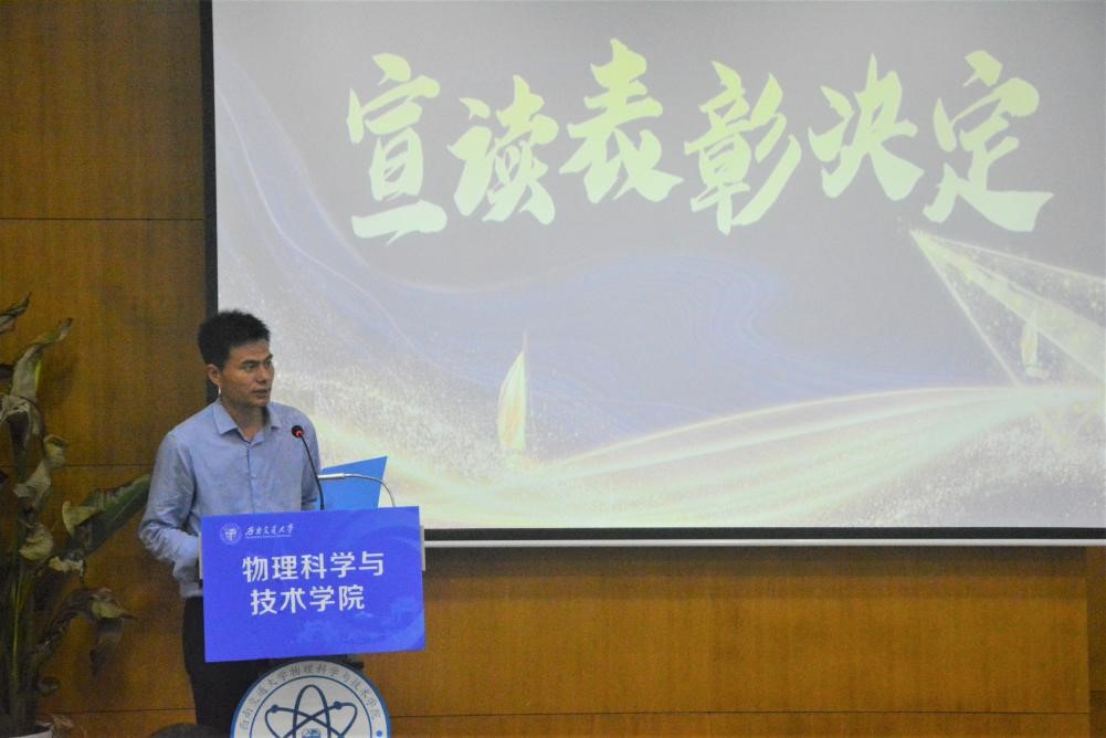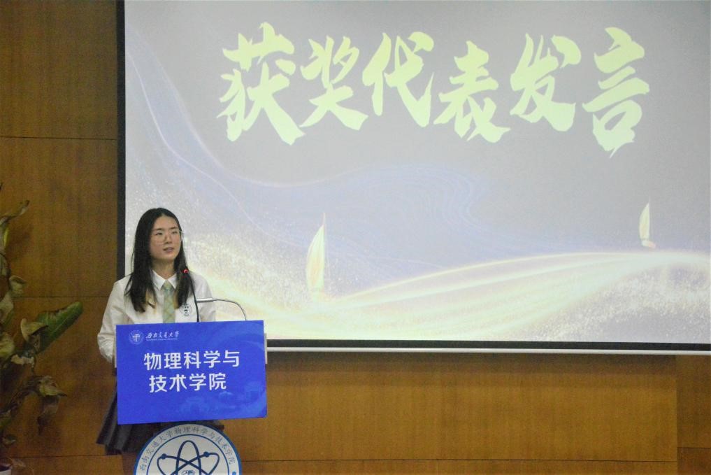 表彰大会上,共有3个先进班级、7个先进宿舍受到表彰。获奖班级代表、物理2018-02班班长石金泽用风趣诙谐的话语介绍了本班级团结向上、取得丰硕成果的“秘籍”,他表示优良上进的班级学风、积极有效的升学动员和齐心协力的集体建设共同成就了同学们的辉煌成绩。优秀宿舍代表、来自T154046的朱清杨用朴实的话语道出宿舍和谐关系的“生活经”,她提到适当的相处方式、合理恰当的协作和真诚友好的态度共同造就了四年来的累累硕果。青年最富朝气、最有梦想,2022届毕业生们以梦为马,书写了自己的青春传奇,以他们为代表的物理学子拼搏向上、砥砺前行,展现了新时代交大学子的青春风貌。